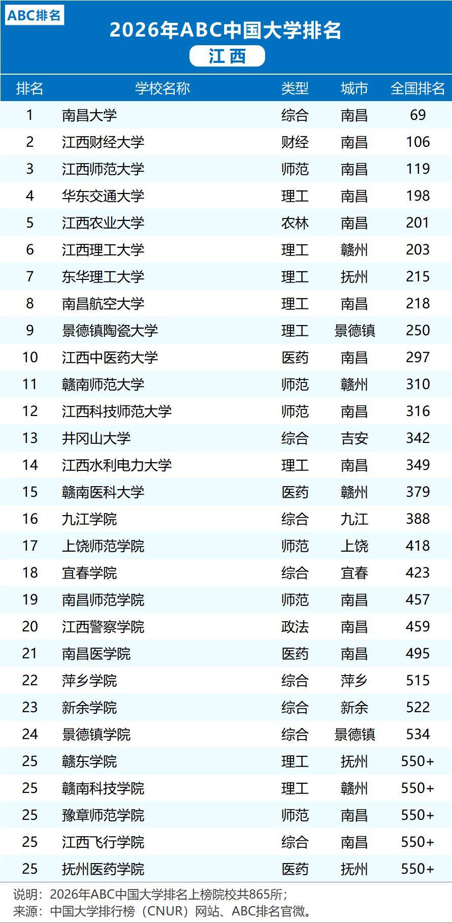 正在最新发布的2026年ABC中国大学排名中,江西省内高校的合作款式呈现出令人注目的新景象形象。南昌大学凭仗其雄厚的分析实力,继续稳坐江西高校的头把交椅,以全国第69位的排名,展示了其做为省内高档教育领头羊的地位。江西农业大学(第201位)和江西理工大学(第203位),这些高校的成长势头同样强劲,各自由劣势学科范畴内不竭冲破。